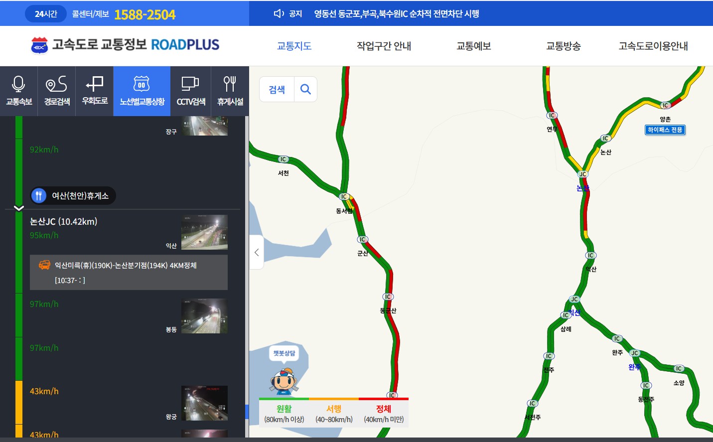 - 논산 이남 정체 : 호남선 정체가 심하다면, 논산-천안 민자 구간 대신 국도 1호선 등 평행 국도를 따라 북상하는 것이 빠를 수 있습니다.