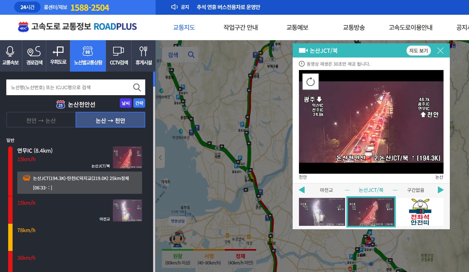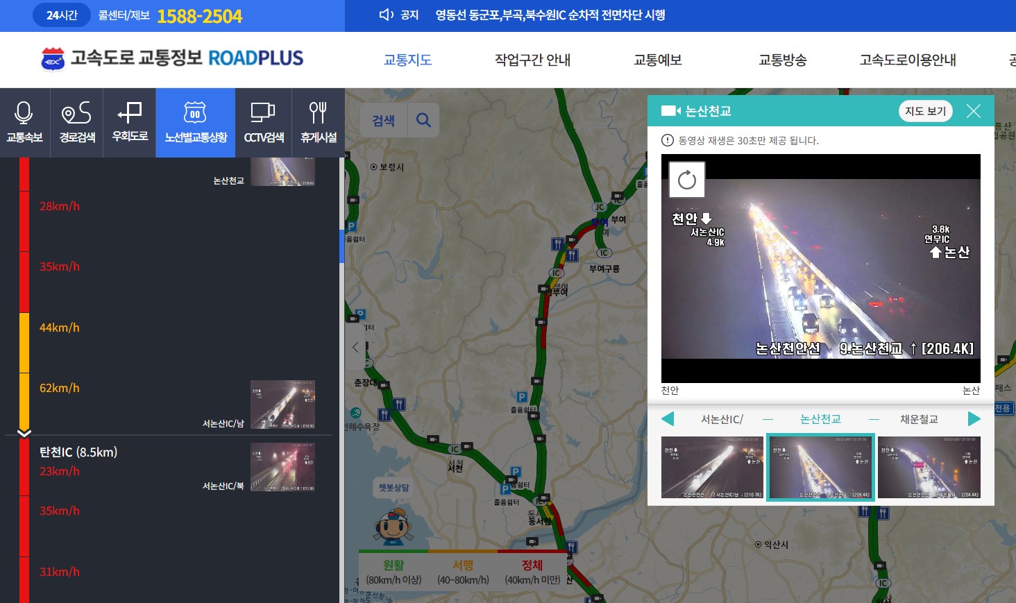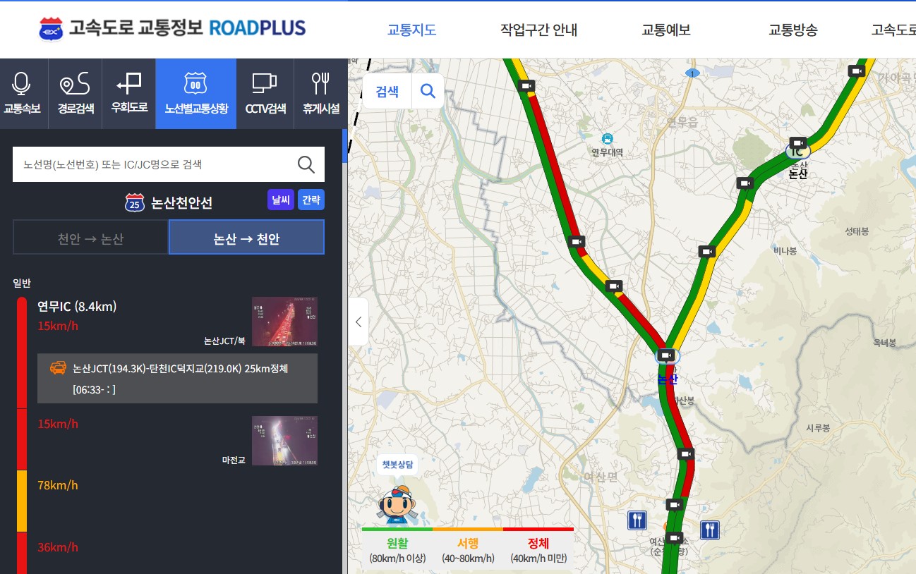 - 접속 후 'CCTV' 메뉴에서 천안논산고속도로 노선을 선택합니다. 논산 분기점(JC)과 정안휴게소 인근의 흐름을 집중적으로 확인하는 것이 정체 파악에 중요합니다.
