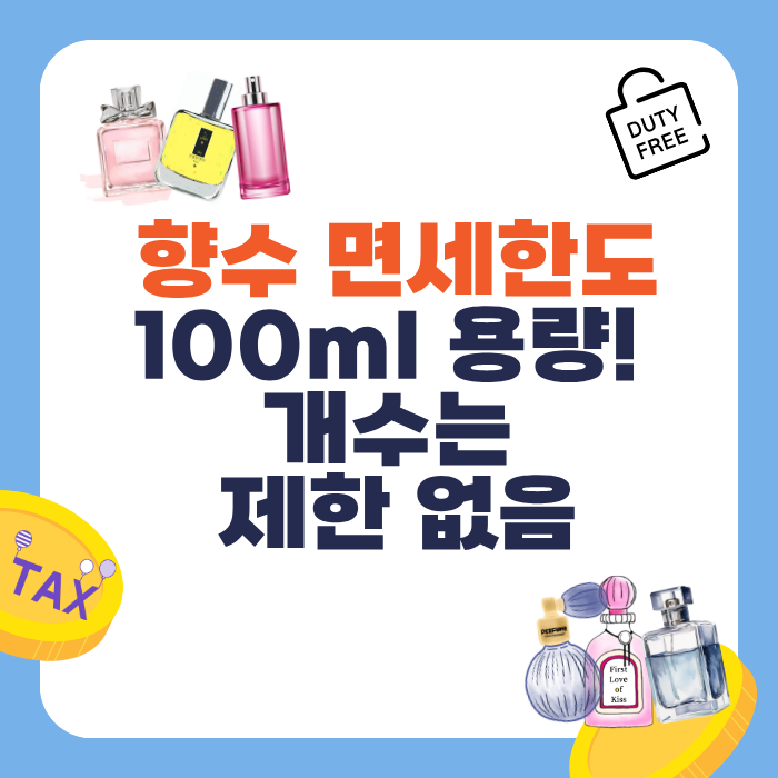 향수 면세 기준은 2024년 1월 1일부터 기존 60ml에서 100ml로 확대되었습니다. 이는 대용량 향수나 다양한 향수 세트 구매를 선호하는 여행자들의 편의를 높이기 위한 조치입니다.