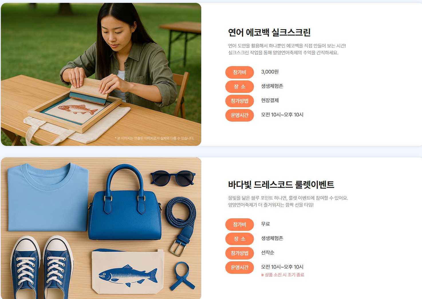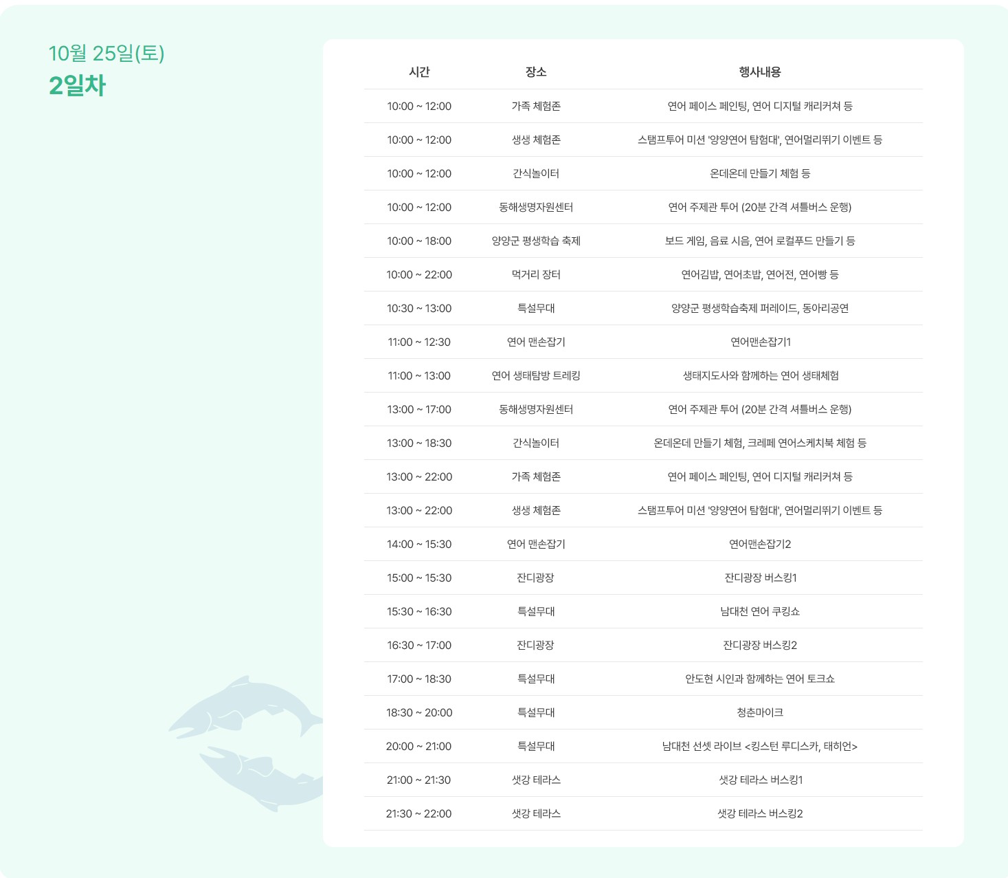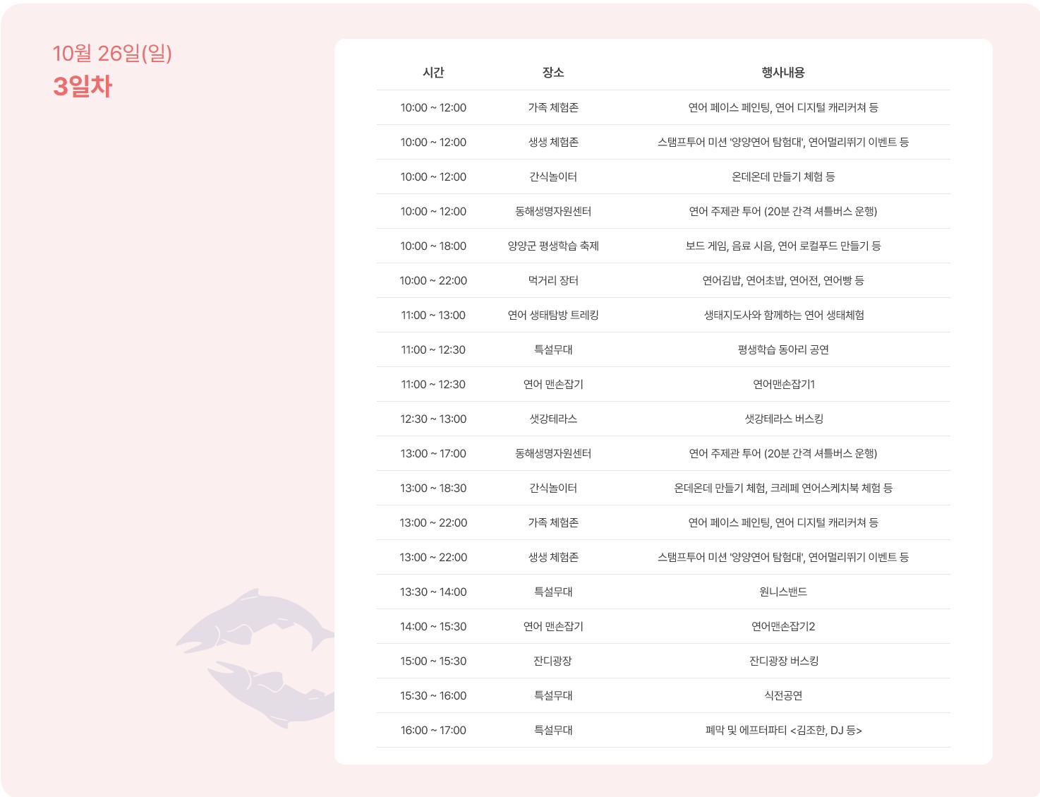 | 축제 장소 | 양양읍 남대천 둔치 일원 | 강원특별자치도 양양군 양양읍 일출로 589 (남대천) |