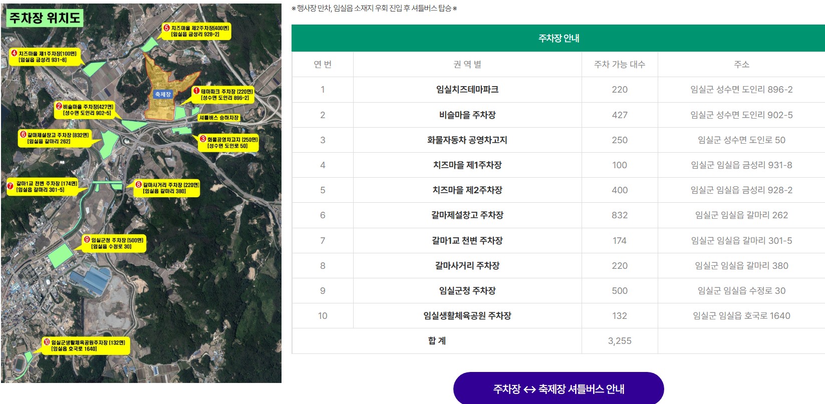 - 주차 공간이 부족할 경우, 임실역 등 외곽에 주차 후 셔틀버스를 이용하는 것이 가장 빠른 방법입니다.